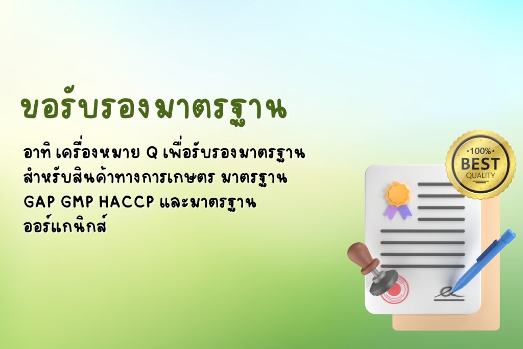 สำหรับสินค้าทางการเกษตรนั้น สามารถได้รับการรับรองตามมาตรฐานที่หลากหลาย เช่น เครื่องหมาย Q ซึ่งเป็นเครื่องหมายที่ได้รับการรับรองจากสำนักงานมาตรฐานสินค้าเกษตรและอาหารแห่งชาติ โดยเครื่องหมายนี้ใช้เพื่อยืนยันแหล่งกำเนิด ส่วนประกอบ วิธีการผลิต รวมถึงคุณภาพหรือคุณลักษณะอื่น ๆ ของสินค้าเกษตร ว่าสอดคล้องกับมาตรฐาน คุณภาพ และความปลอดภัยที่กำหนดไว้ นอกจากนี้ การที่จะได้รับเครื่องหมาย Q นั้น ผู้ผลิตจะต้องผ่านการรับรองตามมาตรฐานอื่น ๆ ก่อน เช่น การปฏิบัติตามมาตรฐานการเกษตรที่ดี (Good Agricultural Practice; GAP) การรับรองมาตรฐาน GMP, HACCP และการเกษตรอินทรีย์ เป็นต้น